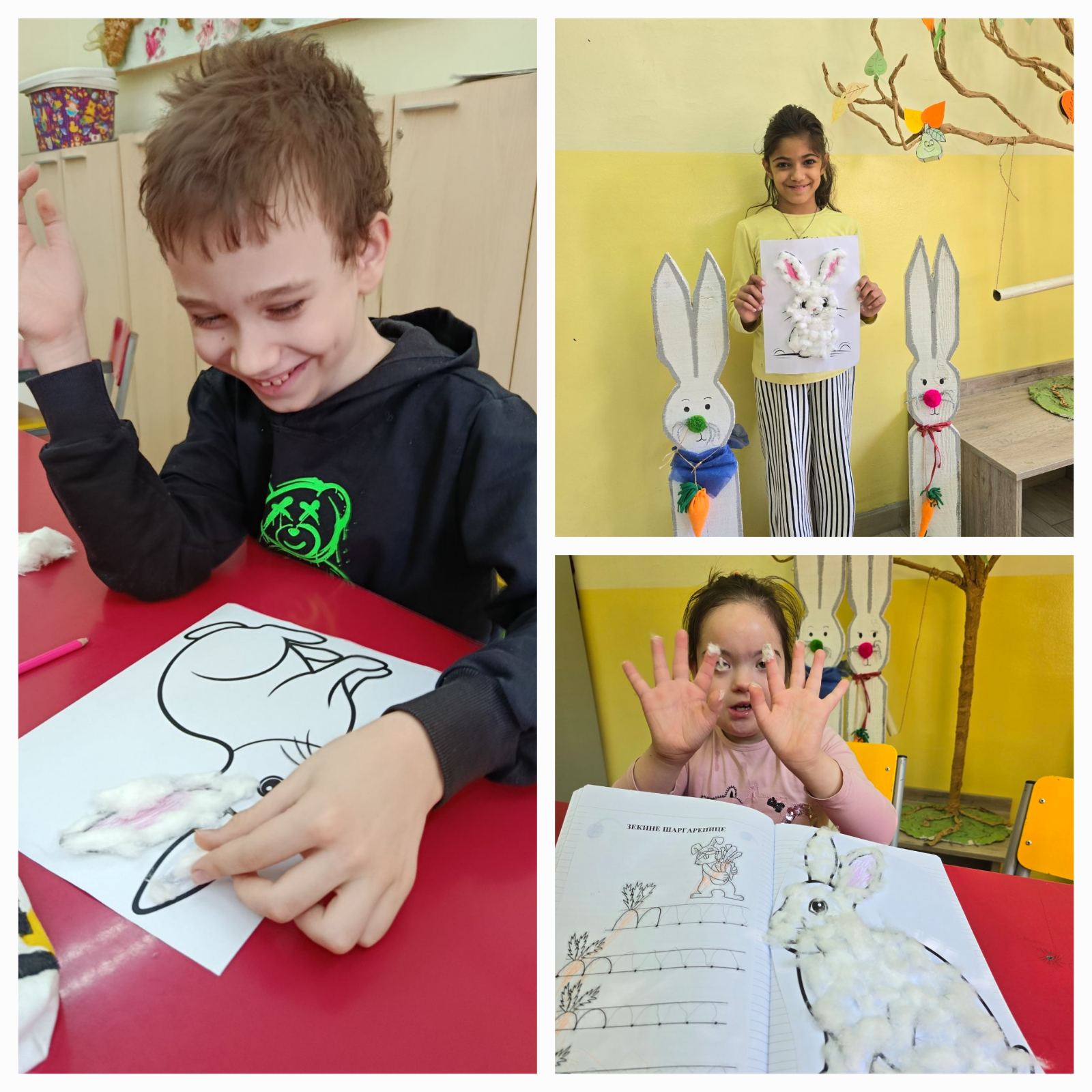 Поводом обележавања Међународног дана зечева у продуженом боравку одржана је радионица за ученике нижих разреда, са наставницама Александром и Мињом. Они су печатима направљеним од најлон кеса осликавали различите шаблоне зечева. Апстрактни рад за час се претворио у разнобојну зечју сенку. Ученици су се забавили и обрадовали резултатима свог уметничког рада.