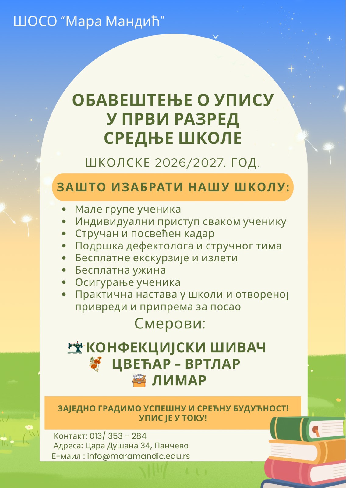 ОБАВЕШТЕЊЕ О УПИСУ У ПРВИ РАЗРЕД СРЕДЊЕ ШКОЛЕ Post author:katrin Post published:13/03/2026 Post category:АКТУЕЛНО Mожда Вас Занима и ово РАДИОНИЦЕ У ОКВИРУ ПРОЈЕКТА „ЗАЈЕДНО И БЕЗБЕДНО КРОЗ ДЕТИЊСТВО“ 29/10/2023 ХУМАНОИДНИ РОБОТ 11/10/2025 УСКРШЊА РАДИОНИЦА У ВРТИЋУ „БАМБИ“ 14/04/2022
