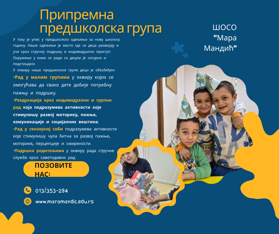 УПИС У ПРИПРЕМНО-ПРЕДШКОЛСКУ ГРУПУ Post author:katrin Post published:13/03/2026 Post category:АКТУЕЛНО Mожда Вас Занима и ово НОВИ МУРАЛ У ШКОЛСКОМ ДВОРИШТУ 08/12/2022 ЈЕСЕЊЕ УРЕЂЕЊЕ НАШЕ УЧИОНИЦЕ 11/10/2025 ДОНАЦИЈА УДРУЖЕЊА „ВИДОВДАН“ 10/06/2019