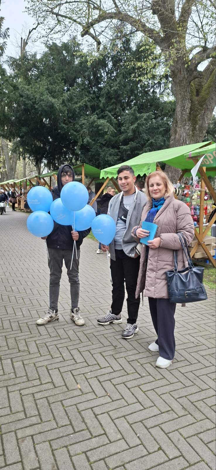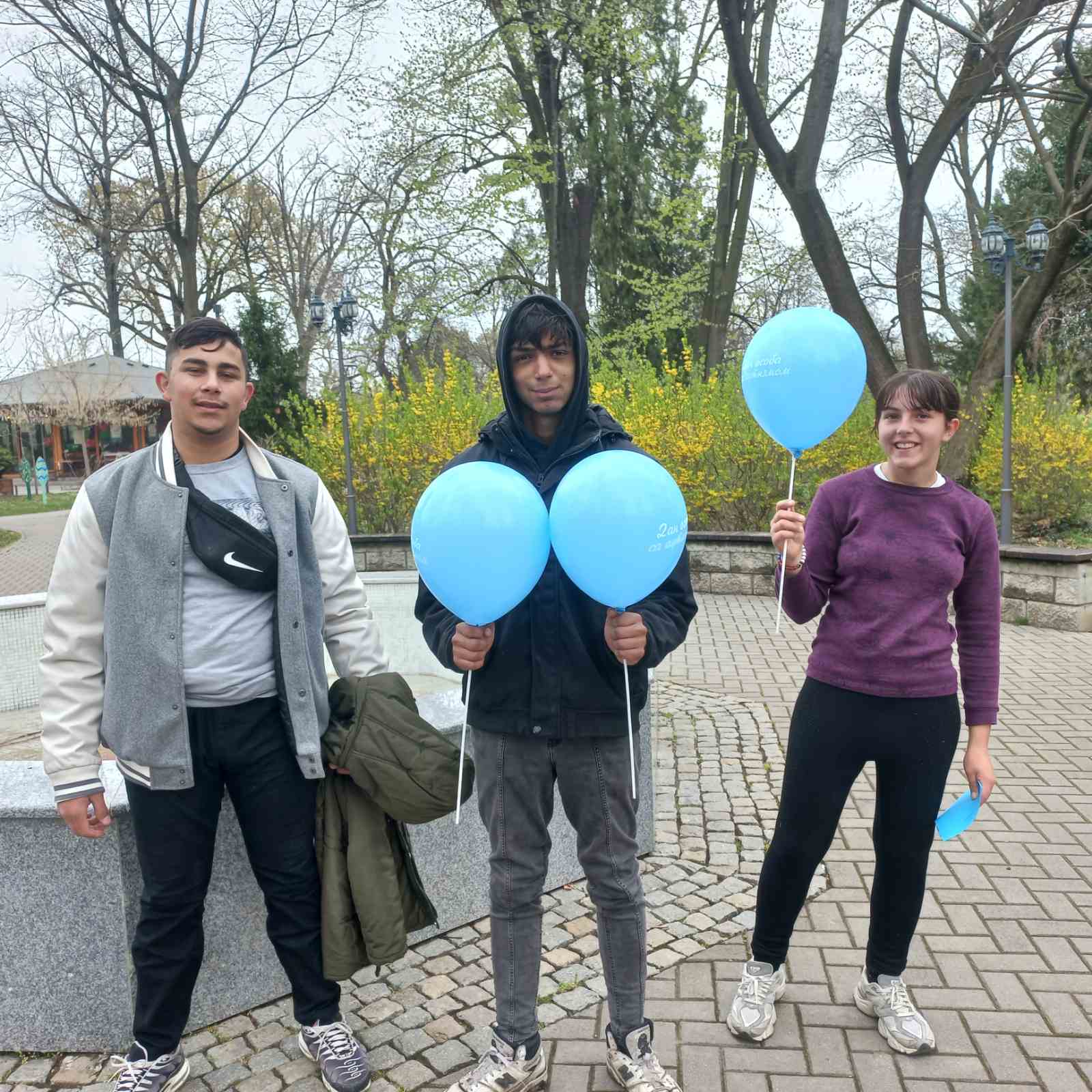 Ученици средње школе, Стамена, Будимир и Јон, дали су подршку својим другарима тако што су са наставницом Катарином прошетали Народном баштом и делили балоне плаве боје и флајере који подстичу свесност о особама са аутизмом.